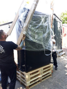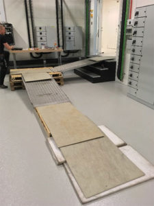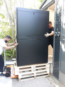Skåpen är mycket stora och tunga, och ingången till serverrummet är liten, men passar perfekt till skåpen. Och dessutom ligger ingången över marken. Skåpens vikt och storlek och ingångens utformning utgjorde rejäla utmaningar när skåpen skulle flyttas – utmaningar som också framgår av bilderna.